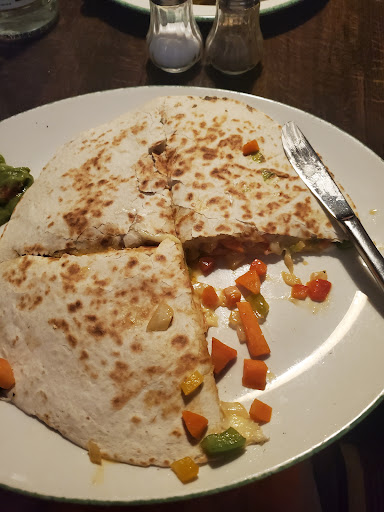 Then my main course, the veggie quesadilla, came. I ordered it sans broccoli and cauliflower because who in their right mind would have either on any quesadilla? I figured it was a safe bet, right? Wrong. Disappointed again. There were SURPRISE carrots over this dish. And I say surprise since it was listed nowhere on the menu listing.