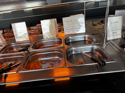 Eher nicht so toll: Gemüse Auswahl zum Braten lassen beschränkt sich auf 2 Sorten Zwiebeln, Champignons, Sojabohnen, Lauch und noch 2 weitere nicht so hochwertige Gemüsesorten Bis auf die panierten Hähnchenstreifen war ALLES von Buffet leider ziemlich trocken in der Auslage waren nur noch (wenn überhaupt) kleine Portionen da Der gebratene Reis leider auch ohne Geschmack, sehr trocken Direkt im Eingang (und auf der rechten Seite) zahlreiche offene Kartons, allgemein etwas chaotisch und nicht sehr einladend Nachtisch hatte mich nicht angesprochen, probiert hatte ich gebackene Banane und Äpfel - Teig trocken und sehr hart für Abholservice wurden offenbar die Reste aus der Auslage verpackt 😞