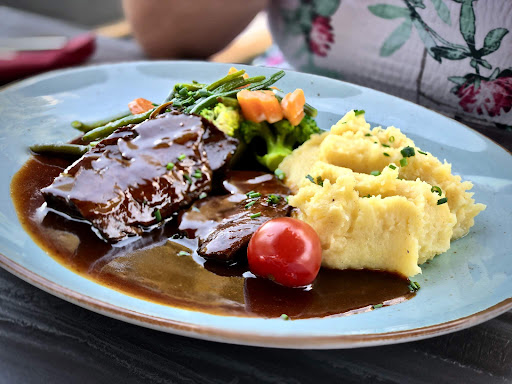 Ein ähnliches Bild bei den Rinderbäckchen. Obgleich ansprechend präsentiert, war dieser Gang leider auch keine allzu große Freude. Lustiger Weise war hier die Portionsgröße wesentlich näher an dem, was gemein hin als "deftig" verstanden wird. Aber weder Menge noch Optik konnten über grobe Patzer hinwegtäuschen. So war das angepriesene "Kartoffestampf" wohl eher ein Püree und von hausgemacht weit entfernt. Das "rahmige Frühlingsgemüse" war teils TK-Ware und wurde nicht mit Rahm, sondern bestenfalls mit einer dieser so geschimpften "Pflanzencremes mit Buttergeschmack" zubereitet. Ein absolutes No-Go für 16,00€! Der Fairness halber muss ich ergänzen, dass die Rinderbäckchen an sich durchaus schmackhaft und zart waren.