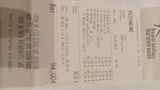 Read moreWenn man denkt, man hat schon alles an Dreistigkeit und Abzocke erlebt…hat gezeigt, dass es immer noch dreister und verlogener geht…!!!||||Gemeinsam mit meinen drei Freundinnen wollte ich in entspannter Atmosphäre meinen Geburtstag nachfeiern, aber bei dem, was wir erleben mussten und was am Ende auf der „Rechnung“ stand, hätten wir auch in die Lokale der gehobenen oder gar der Sterne- Gastronomie gehen können.||||Neben zwei Flaschen Wasser und Wein wollten wir eine Kleinigkeit essen und so haben wir eine kleine Auswahl diverser Fleisch- und Fischspeisen bestellt. Ein Preis hierfür wurde uns nicht genannt, aber was dann am Ende des Tages auf der Rechnung stand, war eine Art „Raubüberfall“.||||Nochmal kurz zur Erinnerung und besseren Verständnis:||||• vier Freundinnen mit etwas Hunger gehen zu diesem Laden||• wir bestellen auf einer kleinen Platte ein potpourri verschiedener Dinge||• dies war eine Bestellung außerhalb der Karte||• die Platte sowie das ebenfalls bestellte gegrillte Gemüse ( 12 € laut Karte pro Portion x 4, also 48€ ) wurde uns serviert und wir aßen jede ein paar kleine Häppchen davon||||Zwei Flaschen sowie ein weiteres Glas Sauvignon Blanc, zwei kleine Gläser Bad Liebenzeller Mineralwasser...ein Espresso und eine Tasse Kronenkaffee haben wir über den ganzen Abend getrunken.||||Auf der Rechnung befanden sich folgende Positionen||• 2x Ganze Barberie Entenbrust gegrillt ( ca. pro Portion 400g )||• 3x Gegrillte Kalbsleber mit Apfel und Zwiebeln||• 3x Filetstreifen aus der Hühnerbrust||||Also insgesamt 8 ( !!! ) Hauptgänge nach dem gegrillten Gemüse als Vorspeise.||||Die Gesamtpreise der o.g. 8 Hauptgerichte waren wie folgt||• 48 €||• 54 €||• 51 €||||Also insgesamt 153 € - für Gerichte die wir zu keiner Zeit bekommen haben und die wir aufgrund der Menge so niemals bestellt hätten, denn die Portionen im DEUTSCHEN KAISER sind sehr groß.||||Denn mit weiteren unlogischen Positionen ergab sich ein Rechnungsbetrag i.H.v. 340 € !!||||Am nächsten Tag reklamierte ich die Rechnung und diese wurde durch das Streichen kleiner nebensächlicher Positionen zweimal geändert. Aber die Positionen der 8 Hauptgerichte blieben unberührt, obwohl diese nachweislich falsch sind.||||Der weitere Mailverkehr brachte letztlich keine Einigung. Alle Argumente wurden in arroganter Weise ignoriert oder mit verzweifelten Erklärungen versucht zu erklären.||Mein Hinweis, dass man anhand der Bestellung und der ordnungsgemäßen Einbuchung in das Kassensystem dies nachvollziehen könnte, wurde barsch weggefegt.||||Und dann hat sich der Inhaber etwas erlaubt, was sehr tief blicken lässt in sein Geschäftsgebahren. Neben dem für mich und meine Freundinnen ausgesprochenen Hausverbot versuchte er eine Rezession zu verhindern, indem er damit drohte, alle Mittel zu nutzen, um dagegen vorzugehen. Diese Art der Einschüchterung ist befremdlich.||||Wohlgemerkt: Wir sind leicht hungrig aus dem Laden...