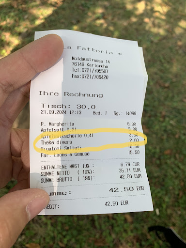 Read moreNIE Empfohlen. Lieber woanders gehen, besonderes für Familien mit Kindern!! Ich will einfach 0 Sterne geben!! Wir sind zwei Familien und insgesamt 3 Erwachsene und 2 Kinder (beide eben 3 Jahre alt). Wir haben 2 Pasta, 1 Pizza und 2 Glase Saft (1 große und 1 kleine) bestellt, die alle nur solala schmeckt. Die Nerven fängt an, wenn wir extra Teller wollen, weil wir das Essen mit dem Kinder teilen möchten. Es gibt auch keine Kinder Portion von dem Anbieter. Wir wollen auch extra kleine Glas, weil der große Glas für der 3-jährige zu groß ist (zu hoch direkt von dem Glas zu trinken). Jedoch entsteht dafür einen 2 Euro Aufschlag, welche wir NIE woanders erlebt haben. Wir haben uns darüber beschwert. Aber der Geschäftsführer meint, wir sind zu laut und sind von dem Laden nicht mehr willkommen. Zusammenfassung: NIE Empfohlen. NICHT hier zu besuchen....