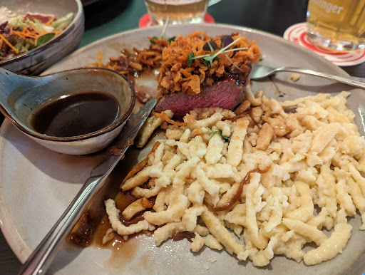 Essen war alles frisch und wohl auch frisch zubereitet. Schnitzel, nicht ausm Metro, sondern selbst in der Butterpfanne ausgebacken. Saucen könnten aufgepimpte Fertigsaucen sein und von der Menge her auch gerne etwas mehr. Aufm Salat hätte ich auch gerne mehr herzhafteres Dressing gehabt. Alles in allem, einfache, gute Hausmannskost, ohne Raffinesse, dafür aber ordentliche Portionen.