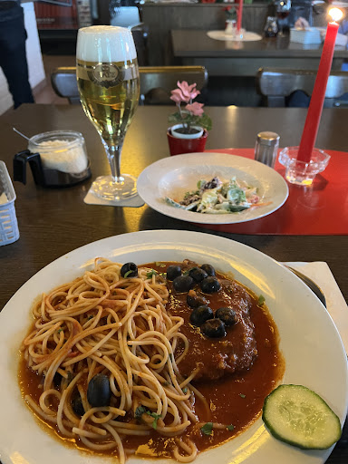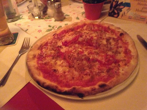 Ich habe mir ein paar der schlechten Rezensionen durchgelesen, ich bin wirklich sehr empfindlich was Rauch Geruch angeht, aber im vorderen Teil war davon wirklich nichts, zu den anderen Bereich hinten kann ich nicht wirklich sagen, wir saßen genau am Übergang, stärken rauch Geruch hätte ich gemerkt... . Auch unsere Tischdecke war sauber und es gab nichts das mir sonderlich aufgefallen ist. Das Besteck war sauber und es waren gezahnte Pizza-/Steak-Messer, taugten also auch was. Das Essen kam recht zügig, mussten nicht lange warten, welches sehr gut war, denn einige waren schon fast am verhungern als wir ankamen. Ich hatten einen gut gemischten Tisch: Steak, Scaloppina, Pizza. Alles mehr als nur sehr solide. Highlight natürlich die Pizzen. Sie haben sehr gut geschmeckt, typisch italienisch, nicht wie manche vielleicht gewohnt sind vom Döner-Mann, sondern aus dem Steinofen, der im Gästebereich zu sehen ist. Das macht das Ambiente sehr gemütlich. Allgemein ist es altmodisch aber sehr gemütlich dort. Ein Restaurant, in dem man auch mit den Schwiegereltern Essen gehen kann, keine typische Studenten Kneipe wie das Oxford pub/cafe/... oder kippe/emaille/... .