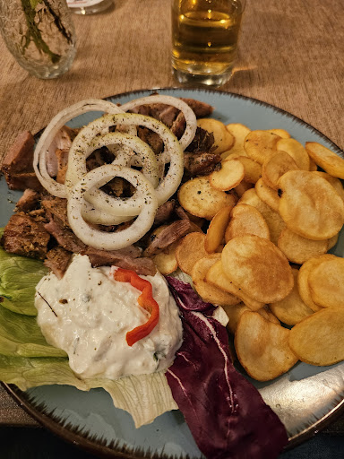 Mittagstisch; Ambiente vom Lokal ist in Ordnung, es kommt durch die großen Fenster viel Licht rein, auch der größere Raum ist nicht verwinkelt. Ausstattung eher nüchterner, aber nicht kalt. Sind nicht viele Staubfänger vorhanden, was seinen Vorteil beim Essen hat. Sauberkeit ist auf den ersten Blick absolut da, Örtlichkeiten wurden nicht besucht. Bedingung ist nett und höflich, eher zurückhaltend. War auch sofort da, als ich reingekommen bin. Nach dem Platz aussuchen war Sie auch sehr schnell mit der Karte bei mir. Vielleicht hätte man noch 15 Sekunden warten können, denn ich habe mir gerade die Jacke ausgezogen. Aber vielleicht für manche Gäste vom Vorteil, wenn man kurz in der Mittagspause was essen möchte. Preise sind eher durchschnittlich, vielleicht ca. 1 oder 2 Euro drüber im Allgemeinen Vergleich. Wasser 0,3 Liter für 3 Euro, vielleicht auch hier 50 Cent mehr als woanders. Hausteller mit Biftecki, Schweinefleisch, Gyros, Pommes und Salat. gehabt, weil ich gerne verschiedene Sachen probiere. Menge absolut ausreichend. Salat kam wie üblich als "Vorspeise". Der bestand aus eine Menge Eisbergsalat, darüber eine kleine Olive, eine kleine Peperoni und dann Dressing. Über dem Dressing gehackselte Möhre. Ich probiere gerne die Sachen einzeln, weil ich einen guten Eindruck von dem Essen gewinnen kann. Die Möhre war ohne Gewürze, was absolut ok ist. Was ich aber sehr vermisst habe, ist der Eigengeschmack dieser. Es kam mir fast neutral vor. Darunter war die kleine Olive und kleine Peperoni. Waren geschmacklich gut, aber ein Bissen und schon weg. Der Eisbergsalat war normal, da braucht man nicht viel reden. Das Dressing (es war ein French Dressing) war sehr schlecht. Sehr Essighaltig, beißend vom Geschmack und machte für mich aus dem eher neutralen Salat, einen Salat den ich nicht essen möchte. Schade, denn es nicht so schwer, ein (vielleicht selbstgemachtes) gutes Dressing zu erzeugen. Nach dem obligatorischen "Hat es geschmeckt" habe ich auf den Salat hingewiesen. Antwort war, dass ich beim nächsten Mal das Dressing weglassen kann. Ja, ist eine Lösungsmöglichkeit... Die andere wäre, sich nach dem WARUM zu erkundigen, warum das Dressing für mich ungenügend ist. Meiner Meinung nach besser, denn dann besteht vielleicht die Chance, den Geschmack des Kunden zu erfahren und vielleicht (natürlich wenn genügend andere Kunden das auch so sehen), dass Dressing zu verbessern. (Bei dem Dressing ab in die Mülltonne und bitte Neues kreieren). Hauptgericht: Pommes waren ausreichend im Geschmack. Leider hatten diese (wie es bei manchen Pommes so ist) einen Eigengeschmack der mir nicht zusagte. Das war kein großes Ding, aber eher in der Schulnote 4 anzusiedeln. Das Biftecki war gut, es war stark gewürzt (vielleicht ein Hauch too much). Man sah und schmeckte, es war saftig, es waren frische Petersillienblätter zu sehen, der Oregano kam durch... Manko war, dass ich bei dem Käse im Bifteki eher auf Hirtenkäse aus Kuhmilch als auf Feta bzw. den Schafskäse schließe. Der Käse war einfach nicht beim Braten zerlaufen, er war zu trocken... Und schmeckte mir halt nach Hirtenkäse. Das Schweinefleich war gut, auch gut gewürzt, vielleicht ne halbe Minute eher von der Pfanne nehmen. Ein Aushängeschild eines jeden griechischen Lokals ist für mich das Gyros und das Tzatziki. Tzatziki: Das war gut, die Gurke, Oregano und der Knoblauch kam gut durch. Habe 3 bis 4 Gäbelchen pur probiert, könnte man auch schön mit Baguette essen. Das Gyros war auch nicht von schlechten Eltern. Was mir auffiel, es war relativ mager, gut gewürzt und auch eine gute Kombination zwischen Knusprig und Fleischig. Durch das magere Fleisch kann es natürlich nach paar Minuten auf dem Teller etwas "trockener" werden. Dieses nehme ich aber gerne beim Gyros in Kauf, wenn ich nicht auf "Fleischstücken voller Sehnen" rumkauen muss. Fazit: In das Restaurant kann man durchaus hingehen, akzeptabel. Es wird von mir keine Empfehlung für grandioses Essen und erst recht nicht für einen WOW-Effekt. Aber ein solides vernünftiges Essen. 3 Sterne mit einem Hang...