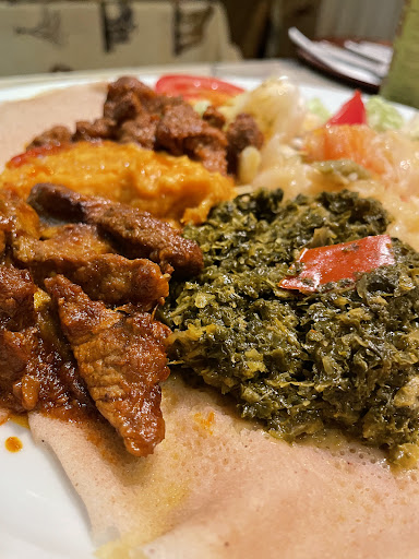Die Atmosphäre und die Dekoration sind sehr schön, und man fühlt sich vom ersten Moment an wohl und willkommen. Als wir das aromatisierte afrikanische Bier bestellten, nahm sich die Kellnerin die Zeit, uns zu erklären, worum es sich dabei handelte, was sehr nett war und geschätzt wurde. Als Vorspeise hatten wir die vegane Linsensuppe und einen einfachen Salat mit Fetakäse. Beide kamen prompt und schmeckten ausgezeichnet. Die geteilte Platte kam kurz darauf und schmeckte ebenfalls fantastisch. Das Fleisch war gut gewürzt und hatte eine ausgezeichnete Balance zwischen würzig und schmackhaft. Das Injera-Brot war im Gegensatz zu anderen eritreischen Restaurants, die ich besucht habe, nicht zu würzig.
