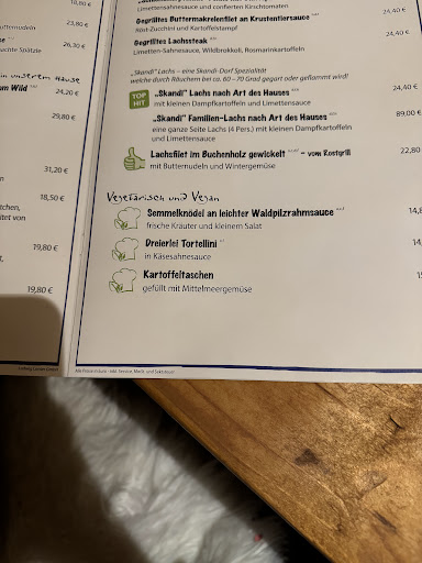 FĂŒr ein Abendessen zu viert mit unseren Freunden aus England wollten wir etwas Besonderes und hatten einen Tisch im Skandidorf reserviert. Aufgrund diverser UnvertrĂ€glichkeiten ist eine Person in unserer Runde auf eine vegane ErnĂ€hrung angewiesen. Die Vorabrecherche ergab, dass dort wenigstens ein Gericht vegan sein sollte. Bei der Bestellung wurde von unserer Seite nochmals extra nachgefragt, ob ein bestimmtes Gericht vegan sei, was von der Bedienung bejaht wurde. Als das Essen serviert wurde, enthielt das vermeintlich vegane Gericht jedoch Sauce Hollandaise auf dem GemĂŒse. Die Mitarbeiterin, die wir nach dem vermeintlich veganen Gericht gefragt hatten, behauptete dann, wir hĂ€tten nach vegetarischer Kost gefragt und auĂerdem wĂ€re keines der Gerichte vegan, da das GemĂŒse âselbstverstĂ€ndlichâ in Butter geschwenkt wird. Als Ersatz wurde uns ein Salat mit Waldpilzen angeboten, bei dem wir das Dressing selbst zubereiten sollten, da das regulĂ€re Dressing Joghurt enthielt.