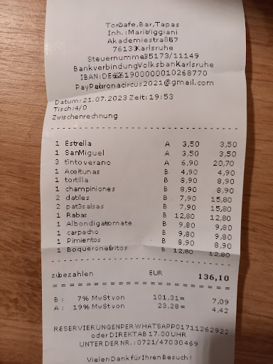Read moreFDP & Nein das soll hier kein billiges polit bashing werden - aber die Partei beschreibt das Restaurant ziemlich super. Warum? Viel Geld für mittelmäßige Qualität - ein auf Gewinnmaximierung ausgerichtetes Unternehmen, so wie die FDP es sich erträumt. Das Restaurant ist auch für eine Tapas-Bar hochpreisig (Konkurrenz in Karlsruhe ist günstiger) & trotzdem wurde der Raum gewinnoptimiert ausgeschöpft und mit so vielen Tischen vollgestellt, dass selbst die Bedienung kaum Platz hat durchzukommen. Diese war aber sehr nett, auch wenn sie unsere Brotbestellung regelmäßig vergessen hat & wir teilweise unsere Bestellung erst nach unserem Nachbartisch (welcher das gleiche nach uns bestellt hat) bekommen haben. Nun zum Essen: Teilweise lieblos angerichtet hatte bspw das Brot eher den Anschein von einem günstigen Aufbackbaguette als von einem hochwertigen Weißbrot & auch die anderen Speisen waren alle eher Basic, selbst das teuerste Gericht auf der Karte hat unseren Geschmack nicht getroffen. Auch hier hatte es den Anschein als würde nur das nötigste Serviert ohne eine Idee von Glanz oder Extravaganz. Auch das Bezahlen funktioniert nicht mit Kreditkarte (vermutlich ist da jemand nicht bereit die Gebühren zu tragen) - was eher untypisch ist und eigentlich zum Guten Ton dazu gehört. Fazit: Für 20-30% günstigere Preise wäre es ein gutes & faires Angebot, so aber wirkt es sehr danach als würde versucht das meiste Geld aus dem Angebot herauszuquetschen, da ist es auch nicht wirklich verwunderlich, dass der Besitzer Mitglied bei der FDP ist. P.S. Es werden Rosenverkäufer rein gelassen - das finde ich grundsätzlich gut und löblich - ist aber in der Masse an Menschen, dann eventuell teilweise doch ein wenig zu eng und unangenehm - insbesondere wenn diese sehr...