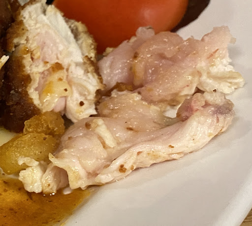 Der Hammer war aber das Cordon Bleu vom Huhn das trotz der dunklen Panade innen noch völlig roh war (siehe Bild). Gerade bei Geflügel ein absolutes NoGo. Das Fleisch war zu dick geschnitten, offensichtlich nicht geplättet und wie eine Roulade gerollt. Vermutlich auch die Fritteuse zu heiss um das Fleischpaket durchzugaren bevor die Panade tief dunkelbraun ist.