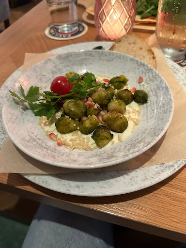 Essen: Ich habe mich an diesem Tag für ein Gericht aus der Hebstkarte entschieden: "Kugelrund und bunt". Dahinter verbirgt sich lauwarmer Rosenkohl auf Hirtenkäsecreme, verfeinert mit gehackten Mandeln und Granatapfelkernen. Dazu ofenfrisches Brot. Ich freue mich immer, wenn mich auf einer Karte kreative Gerichte erwarten, zumal sich viele Locations eher nicht an Rosenkohl als Hauptzutat wagen. Da Rosenkohl und Hirtenkäse von Prinzip aus schon sehr viel Eigengeschmack mitbringen, war das Gericht nahezu ein Selbstläufer. Mir hat das Gericht auch gut geschmeckt, lediglich die Granatapfelkerne waren etwas unterrepräsentiert und sind im Gesamteindruck untergegangen. - 4/5