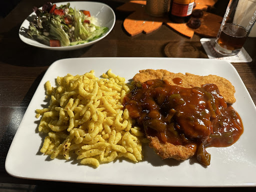 Das Essen ist gut und reichlich. Bestellt man ein Schnitzel, erhält man sogar zwei. Man kann auch unpaniertes Schnitzel bestellen wenn man es möchte. Soße gibt es reichlich dazu und es kommt selten vor, aber hier werde ich satt, wenn ich hier esse. Und das zu einem noch vernünftigen Preis (unter 20 Euro).