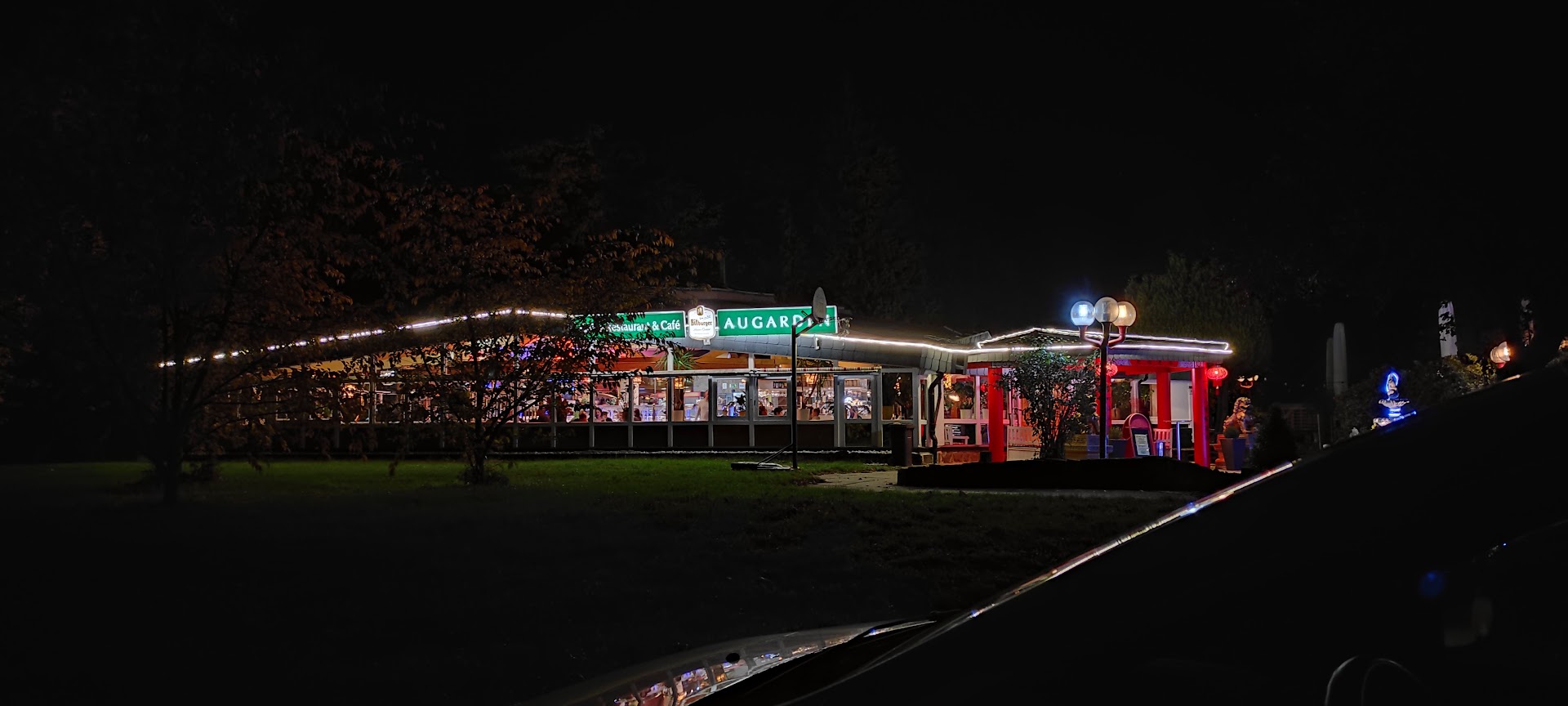 Grundsätzlich kann ich das Lokal empfehlen, wg der guten Lage an der Karlsaue und dem idyllischen Biergarten. Wir waren am Freitag zum Mittagsbuffett dort. Hatten einen schönen Platz draußen direkt am Teich. Dieser sieht allerdings sehr vernachlässigt aus, das ist sehr schade. Dunkles, schmieriges Wasser, Blätter, kein Wasserzulauf für Sauerstoff für die kleinen Fische, die ständig an die Oberfläche kamen. Das könnte man doch ändern. Das Mittagsbuffett war reichlich vom Angebot, leider waren die Nudeln kalt und die verschiedenen Speisen noch nicht mal warm, somit hat es uns nicht geschmeckt. Auch andere Fleisch/Fischangebote sowie frittierte Speisen waren lau und schwabbelig. Ganz fürchterlich, kein Genuss. Obst und Eis ließen sehr zu wünschen übrig. Die Ananasscheiben waren alle angefault, die Weintrauben weich, das Eis war viel zu weich in der Truhe und zerlief sofort auf dem Teller. Wir haben der Bedienung dies auch gleich mitgeteilt, dass die Eistruhe unbedingt kühler eingestellt werden muss. Das Mittagsbuffet war eine riesen Enttäuschung. Das kann man absolut nicht weiterempfehlen. Bis jetzt hatten wir das Lokal nur abends besucht und da war das Essen wesentlich besser. Auch gibt es abends die Auswahl an rohem Fisch/Fleisch u Gemüse, welches man sich direkt am Grill zubereiten lässt. Das schmeckt immer prima. Dieses Mal hatte man das Gefühl, dass es aufgewärmte Speisen vom Vortag sind. Also Mittagsbuffett nie...