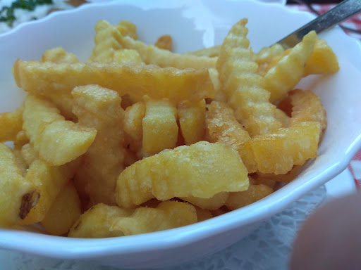 Leider waren wir von den drei Schnitzeln aus der Mittwochskarte nicht so begeistert. Die Konsistenz des Fleisches erinnerte irgendwie an „Pressschnitzel“, die gleichmäßige Farbe an Fritteuse. Auch nur deshalb konnte das Essen scheinbar auch so schnell serviert werden. Die warme Kochkäsesauce war mal was anders und okay, die „Champignonrahmsauce“ allerdings sah aus und schmeckte wie eine Jägersauce aus der Tüte. Unser Kind fand den Kräuterschmand auch nicht ganz so lecker. Die Pommes waren okay, aber da kann man ja auch nicht so viel verkehrt machen.