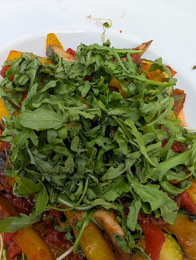 We were with our German host who asked the man at the counter a question about seating and ordering food, and he then shouted at her and the group for around 5 minutes. He then shouted at a customer for taking a spoon (to eat the food purchased from them). I've never had such poor customer service. My Mediterranean vegetables were really tasty, although the rocket was past it's best (see picture). My wife enjoyed her cannelloni and my beer was really nice.