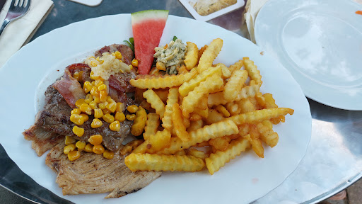 Dan het eten. Het Schnitzel was prima, maar het vlees van de grill viel enorm tegen. De kalkoen was droog als karton, het varkensvlees was oké. Maar het rumpsteak stonk als een oude bok en smaakte duidelijk bedorven. Toen ik de serveerster erop wees, rook zij er aan, trok een gezicht en zei ook dat het walgelijk rook. Maar ze kwam iets later uit de keuken met de mededeling dat de kok had aangegeven dat er niks mis mee was. Ondertussen waren tientallen vliegen aan het neerstrijken op het stukje vlees dat ik niet had gegeten, die vonden het wel lekker. De patat was hard, te lang gefrituurd en droop van het vet. Het tweede, bestelde drankje werd nooit gebracht.