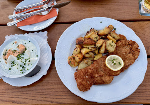 Wir entschieden uns für die Tagesempfehlung – Schnitzel mit Bratkartoffeln und grüner Soße mit Ei. Zur Auswahl standen Kalb, Schwein oder Hähnchen – das allein zeigt schon, dass hier mitgedacht wird. Wir wählten das Schweineschnitzel, und was soll man sagen: Perfekt! Knusprig, saftig, und meiner Meinung nach in Butter gebraten – einfach so, wie ein gutes Schnitzel sein muss. Die Bratkartoffeln waren herrlich goldbraun, die grüne Soße frisch und rund im Geschmack.