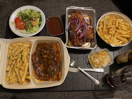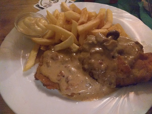 Jägerschnitzel (vom Schwein) mit Pommes (13,50 €) Zwei kleine Schnitzelchen (preislich nicht angemessen) mit einer Champignon-Rahmsauce statt einer durch den Namen versprochenen Jägersauce. Jeder Gast mit Lactose-Intoleranz würde sich hier über die offensichtliche Fehlinterpretation des Namens besonders freuen…