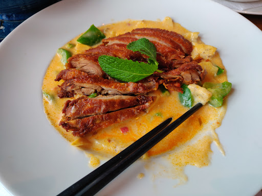 Ente mit Kokos Soße und Gemüse Soße sehr dickflüssig, fast cremig. Geschmacklich okay. Leider auch wenig Gemüse. Die Ende knusprig aber unter der Haut fettig, zum Teil durchwachsen. Konnte man essen aber würde ich nicht nochmal bestellen.