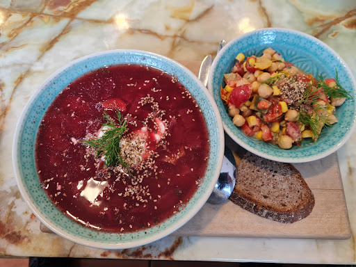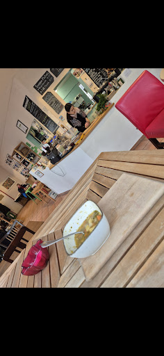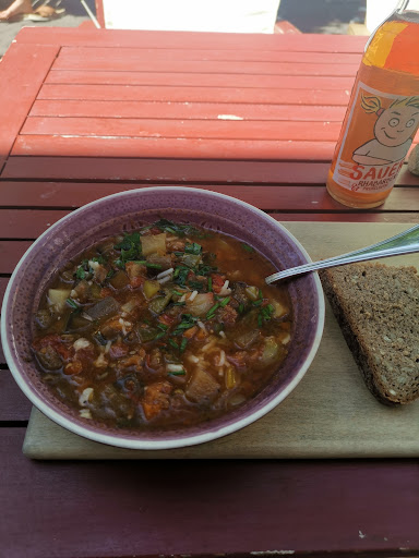 Read moreIch wurde vor einigen Wochen mittags mal mit hier hin genommen. Das Personal ist hier sehr freundlich. Die Einrichtung erinnert ein wenig an einen Flohmarkt, was ganz gut zum nachhaltigen Konzept passt. Ich hatte eine Lauchcremesuppe. Dazu gab es eine Scheibe Brot. Leider fehlte mir bei der Suppe etwas der Geschmack und die Würze. Ich habe hauptsächlich die kleinen Schnittlauch-Stückchen an der Oberfläche geschmeckt. Vielleicht war es auch einfach die falsche Suppe für mich Ich werde bei Gelegenheit nochmal vorbei schauen und eine andere...