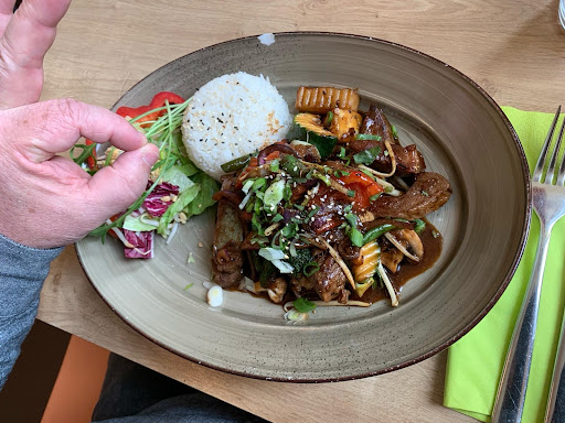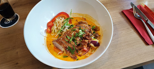 Dazu Reisbandnudeln mit knuspriger Ente und einem roten Curry(siehe Bild). Nicht zu scharf für die Deutsche Geschmackspalette, alles frisch, erstklassig angerichtet und eine große Portion bei einem sehr guten Preis-Leistungsverhältnis. Schon viel gegessen, aber das ist hier in Kassel auf jeden Fall Platz 1, 2 oder 3, keinesfalls schlechter!