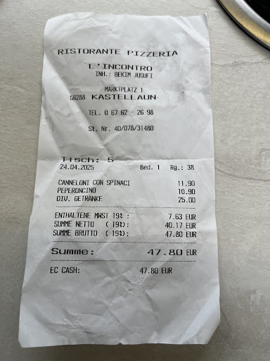 Read more⭐️⭐️⭐️⭐️⭐️ Die Pizzeria L’incontro in Kastellaun ist absolut empfehlenswert! Die Pizza ist immer frisch, knusprig und mit hochwertigen Zutaten belegt – genau so, wie man es sich wünscht. Auch die Pasta-Gerichte sind ein Genuss. Das Personal ist super freundlich, aufmerksam und sorgt dafür, dass man sich sofort willkommen fühlt. Die Atmosphäre ist gemütlich und lädt zum Verweilen ein, egal ob man mit Freunden, Familie oder zu zweit kommt. Preis-Leistung stimmt hier auf jeden Fall – für mich die beste Adresse in Kastellaun, wenn es um italienisches Essen geht. Immer wieder gerne! 🍕🇮🇹. Ich war heute auch wieder da, die Pizzeria ist meine Lieblingspizzaria, das Personal ist so nett und sympathisch, die Frauen machen ihren Job so großartig und generell, ist das was ein Restaurant ausmacht. Wir kommen aus Emmelshausen extra immer, weil die Pizzeria ist einfach die beste die es hier im Umkreis gibt, einfach 👍🏼, es gibt keine bessere Pizzaria. Also geht...