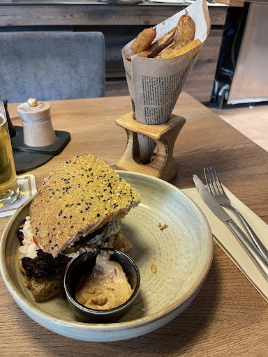 Die Getränke und das Essen waren schön angerichtet, der Salat mit Dressing lecker, das Schnitzel gut und bodenständig, das Gemüse beim Rinderbraten schlotzig, das Fleisch beim Schweinebraten ebenso. Somit wurde von den zwei gebrachten Scheiben nur eine gegessen - der Hunger treibt es rein. Dazu eine dünne Soße die leider nicht wirklich Geschmack hatte. Ob sie überhaupt je eine Zwiebel oder Karotte gesehen hat ist fraglich. Gerettet hätte das von der Bedienung werden können, sie hat ja schließlich nachgefragt. Vielleicht das Angebot eines Verdauungsschnapses oder Espressos? Aber statt sich zu entschuldigen, gab es Ausflüchte und schnippische Bemerkungen. Diese für eine Servicekraft unangebrachte Art hat sich über unseren ganzen Besuch hinweg durchgezogen. Fing bei der Begrüßung an und endete nicht beim zahlen. Da sind 5% Trinkgeld eigentlich noch zu viel. Die Jungs die die Getränke gemacht haben haben es verdient, aber die Bedienung nicht.