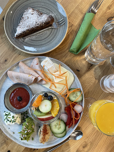 This was truly one of the most amazing food places I have been! They have such a variety of unique and fresh foods, with so many vegan options for both meals and German desserts, and it was all so delicious and fresh tasting! The vegan Brie cheese had the consistency and taste as non-vegan cheese I was so amazed! I got the “Von allem ebbis, vegan” plate which is like a little buffet of everything - vegan cheeses, meat, amazing breads, a yogurt granola fruit parfait, guacamole, hummus, and cream cheese with some veggies. It was so filling and tasty and cool! It comes with their super fresh orange juice too. Perfect for indecisive vegan diners like me hahah! And I also got a slice of the Linzer torte, which was vegan (it’s also gluten-free)! The marketplace is very cool too and has a variety of products for food and home, including organic and vegan things. It’s a very lovely space and the staff was very kind and spoke English very well, which...