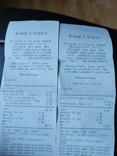 Von außen eher unscheinbar ist nach dem Eintreten die Überraschung groß. Ein sehr gemütliches Speiselokal, das man an der umfangreichen Frischfischtheke vorbei betritt. Die Speisekarte ist nicht sehr umfangreich, dafür aber für den Fisch-und Muschelliebhaber ein kulinarischer Festtag! Nie zuvor habe ich so ein köstliches Muschelgericht in Roquefortsauce gegessen. Preis-Leistung stimmen auch. Toiletten sauber und gepflegt. Das Personal sehr freundlich und immer ansprechbar. Wartezeit mit gut 30 Minuten völlig ok, da verschiedene Gerichte bestellt wurden.Hygienemassnahmen und Kontrollen wurden korrekt eingehalten. Das Lokal ist eine absolute Empfehlung. Ein Stern Abzug wegen des äußeren Ambientes. Update vom 05.03.2022: Unser erneuter Besuch hat alle positiven Eindrücke und Erfahrungen, wie oben beschrieben, eindrucksvoll bestätigt! Es war mal wieder alles köstlich und der Service aufmerksam und flink. Leider kam der bestellte Wein bis zum Schluss nicht. Aber dennoch sind 4 Sterne völlig ok und angemessen. Update vom 17.02.2023: Etwas zu früh eingetroffen wurden wir mit je einem Glas Wein „getröstet“! Sehr gut! Vier verschiedene Gerichte bestellt, die auch alle in angemessener Zeit serviert wurden. Leider war die Roquefort-Sauce ziemlich flach ausgefallen, kaum spürbar. Und die Muscheln der zweiten Kategorie z. T. recht klein, bis auf Kleinfingernagelgrösse… Dafür waren die Pommes einmalig köstlich, frisch, würzig und heiss. Wegen der Sauce Hinweis an die sehr freundliche Bedienung. Das hatte zwei Auswirkungen: Alle bekamen einen Schnaps zur Wahl und, Überraschung: der Wirt brachte mir unaufgefordert eine absolut frische und äußerst schmackhafte Muschelpfanne Roquefort! Dazu Muscheln xxl… Und sein Eingeständnis, dass mein erstes Roquefort-Gericht wohl etwas wenig Roquefort gesehen hätte. Klasse Reaktion und deshalb nun 5 Sterne!⭐️⭐️⭐️⭐️⭐️ Update vom 20.04.2023: Von April bis Mai gibts donnerstags für 32.-€/pro Erwachsener das Fisch- und Spargelbufett! Zunächst eine köstliche Spargelcremesuppe, danach ein umfangreiches Bufett mit Vorspeisen und unterschiedlichen Salaten und Meeresfrüchten und Fisch. Der pikant gewürzte und angebratene Spargel ist ein Gaumenschmaus, was ich so noch nicht kannte. Schließlich Köstlichkeiten zum Nachtisch wie Küchlein, Früchte, Puddings und Erdbeeryoghurt. Bestimmt habe ich einige Speisen vergessen, aber nicht diesen sehr köstlichen Abend im Brands. Der bekannt schnelle und freundliche Service rundete das Erlebnis ab. Absolute Empfehlung,...