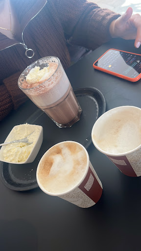 Kurz darauf kam eine Kellnerin und sagte uns, dass wir hier nicht sitzen dürften, weil unsere Getränke im to-go-Becher waren. Ich erklärte die Situation, doch es wurde darauf bestanden, dass wir das Café verlassen. Um bleiben zu dürfen, mussten wir schließlich eine heiße Schokolade zusätzlich bestellen – obwohl der Preis für Cappuccino to go und in der Tasse identisch war.