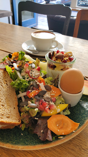 Read moreUnaufgeregt besonders. Ausgesprochen leckeres Frühstück. Hier gibt es getostetes Holzofenbrot, in vier verschiedenen Sorten, (ich hatte Gouda mit süßem Senf) an einem Salatbett (mit super leckeren Dressing u.a. mit Kardamom), einem roten Birchermüsli mit körnigen Topping (oder wahlweise China-Pudding). Das hat meinen Geschmack schon sehr getroffen, aber dann gibt es auch noch Scones mit Frischkäse und Marmelade 😊 und guten Café. Top. Preislich völlig okay: 8,90€ für das Holzofenbrot.