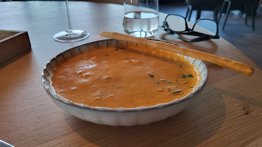 Auf der Suche nach authentischen Aromen und dem besonderen Geschmack. Nordisch reduzierte Einrichtung, große Fensterfront mit Blick auf die Förde, stimmungsvoll illuminiert, gefällt mir sehr gut. Große Vorfreude auf einen kulinarischen Abend in Kiel. Ein sehr gelungener Start war das rösche Brot mit würziger fluffiger Krume, in dicke Scheiben geschnitten, dazu Butter mit Meersalz und ein sensationeller, cremiger Schmand mit Limette und Schnittlauchöl- zum Reinknien. Noch mehr Freude auf einen schönen Abend kam auf. Der erste Gang der a la carte gewählten Speisen, die Regenbogenforelle mit rohen Spargelstücken und eingelegten Tomaten mit Estragon, war sehr filigran abgeschmeckt, aber leider auch wenig spannend. Das kalt aufgeschnittene Roastbeef mit Sauce Ravigote, Fenchel und Brotchips war etwas würziger, letztlich im Geschmacksbild ein gutes Roastbeef mit Remouladensauce, auch wenn Cornichons natürlich nicht in der Sauce Ravigote enthalten waren. Diese Vorspeisen könnten interessanter und mit mehr Geschmack interpretiert werden. Weiter gehts mit der Spargelsuppe und Bärlauch-Öl. Es fällt auf; leider wieder sehr wenig gewürzt. Das Spargelaroma der Suppe war fast nicht wahrnehmbar. Die Bouillabaisse von Ostseefischen enthielt ein paar Stückchen weißen Fisch, der auch nicht näher benannt wurde. Weitere Einlage waren Paprika und Staudensellerie, dazu eine Grissini Stange. Was die tomatisierte Fischsuppe zu einer Interpretation einer Bouillabaisse macht, kann ich in keiner Weise nachvollziehen. Das Gefühl dass im Flygge der aufgerufene Preis und die erbrachte Küchenleistung eine Diskrepanz aufweist, drängt sich immer mehr in den Vordergrund. Ebenfalls irritierten mich weitere Kleinigkeiten, wie die Radieschen, welche in der Vorspeise, auf der Karte bei dem Roastbeef stehen, aber sich stattdessen bei der Regenforelle auf dem Teller befinden. Der Service, der nicht ein Gericht am Tisch annonciert, sondern die Teller einfach einsetzt, weiter wird es der fehlende Rhabarber beim Lamm Hauptgang sein. Dies sind für mich Zeichen von fehlendem Fokus, schwer nachzuvollziehen bei einem Küchenchef der einen Michelin Stern erkocht hatte. Die Hauptgerichte waren leider eine Steigerung unfokussierter Zusammenstellung von Komponenten. Die Präsentationen wirkten überladen und wirr, dazu wenig geschmackliche Tiefe, eher schon als fade zu bezeichnen und total undifferenziert im Geschmack. Was will die Küche mit diesem Wirrwarr auf dem Teller ausdrücken? Dazu kommen handwerkliche Fehler wie die panierte Keule vom Landhuhn. Geflügelkeulenfleisch von hoher Qualität so trocken auszubacken, ich wusste bis dato nicht, dass dies möglich ist. Schade. Die hohen Erwartungen, welche Ambiente und Speisenkarte wecken, wurden an diesen Abend leider nicht erfüllt. Wir gingen ratlos in die Nacht und suchen weiter nach Kulinarik in Kiel. Mehr von mir auf Tripadvisor unter dem kurzen...