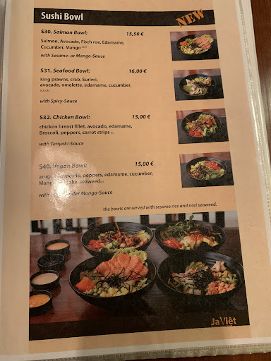 Erstbesuch im JaViet. Mein Mann und ich hatten für Samstagabend 20:30 Uhr einen Tisch reserviert. Ausgesucht hatten wir das Lokal aufgrund der doch recht guten Rezensionen. Wir trafen also pünktlich ein und fanden ein komplett leeres Lokal vor, was uns doch sehr erstaunte. Wir wurden freundlich begrüßt und hatten freie Platzwahl. Schnell wurden uns auch die Speisekarten gereicht. Typisch vietnamesische Gerichte und Sushi. Schnell hatten wir uns entschieden und gaben unsere Bestellung auf. Nach der Getränkelieferung ließen die Vorspeisen nicht lange auf sich warten. Wir hatten beide A7 - Kokosmilchsuppe mit Huhn bestellt. Die Suppe war heiß und sehr flüssig. Einlage waren Champignonscheiben, Zuckerschotenstückchen, Möhrenstücke und sehr wenige und dünne Scheiben Hühnerfleisch. Geschmacklich war die Suppe für unseren Geschmack etwas fade. Zum Ende überwog ein süßlicher Geschmack, den ich als Fehlnote empfand. Kurz darauf wurden die Hauptgerichte gereicht. Wir hatten uns beide f3E3 - Reisfadennudeln mit Rindfleisch und Erdnüssen, Fischsauce und Gemüse. Die Teller sahen auf den 1. Eindruck ansprechend aus. Beim genaueren Hinsehen fand ich ein langes schwarzes Haar in meinem Essen. Ich reklamierte u d bekam nach relativ kurzer Zeit einen neuen Teller. Die Rindfleischscheiben waren offensichtlich neu gebraten, sie dampften noch. Beim Rest bin ich mir nicht sicher. Dennoch aß ich und fand auch keine weiteren Haare im Essen. Unter den Nudeln fand ich Stücke von gemischte Salat (Rucola, Radicchio, gestiftete Möhrchen... ), die mich etwas irritierten, da diese mir in dieser Art in der vietnamesischen Küche bisher nicht begegnet waren. Während unseres gesamten Aufenthaltes unterhielt sich das Personal ziemlich lautstark. Zudem durchquerte die Küchenhilfe mehrfach das Lokal mit Mülltüten und neuen Vorräten. Gegen 22 Uhr hatten sich 2 weitere Paare im Lokal eingefunden. Wir ließen die Rechnung kommen, zahlten und gingen. Die Toiletten haben wir nicht besucht. Das Lokal selber machte einen sauberen Eindruck. Eigentümlich war, dass sowohl Chilisauce als auch Sojasauce in alte "Hoisin-Sauce " - Flaschen abgefüllt auf dem Tisch standen, die dann noch nicht einmal entsprechend gekennzeichnet waren. Und das Sambal Olek war ziemlich eingetrocknet. Kartenzahlung war nicht möglich. Das Essen war (ohne Haar) genießbar, aber erneut recht fade im Geschmack. Da sind wir von vietnamesischer Küche deutlich Besseres gewohnt. Unter Berücksichtigung aller Aspekte unseres gestrigen Besuches gebe ich...
