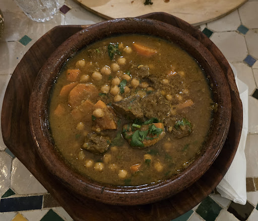Nach der Entnahme des Tonhütchens auf dem Teller offenbarte sich eine marokkanische Spezialität, die meine Omi früher Eintopf nannte. Sie hätte allerdings das Fleisch länger gegart und nicht den Topf mit mehr Kichererbsen beschmissen wie Bomben über Dresden '45 abgeworfen sind.