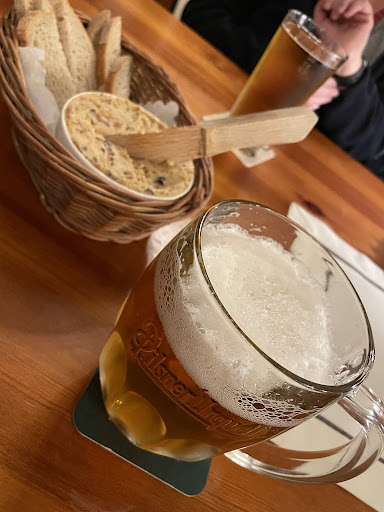 Vorab gab es ein bisschen Brot und Schmalz dazu (Eine Riesenschale voll, im Verhältnis zum Brot einfach viel zu viel und ich ich hoffe, der Rest findet noch irgendwie Verwendung). Wir waren uns einig: Einen so leckeren Schmalz haben wir bislang noch nie gegessen, wirklich sehr, sehr lecker – was das Essen betrifft, tatsächlich leider das Beste an diesem Abend, wie sich herausstellen sollte.