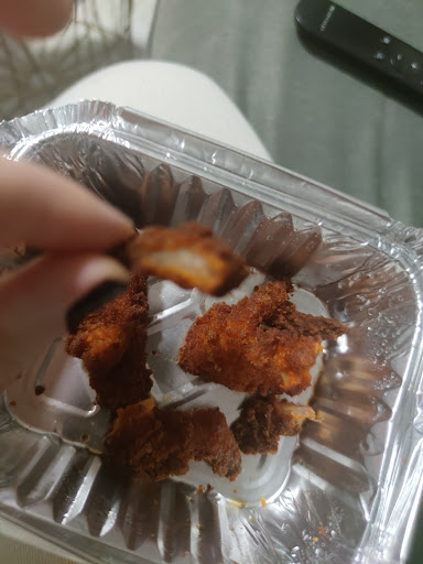 Das soll es aber noch nicht gewesen sein. Die sogenannten „hot chicken stripes“ bestanden aus 2 Gramm Fleisch und 8 Kilogramm Panade. Hier kam die Pommes tatsächlich mit, aber auch diese waren total versifft und haben nur nach fett geschmeckt.