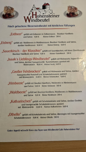 Read moreDas Windbeutelcafé ist ein echtes Juwel für alle, die eine gemütliche und rustikale Atmosphäre lieben. Die Einrichtung ist charmant und lädt mit warmen Holzmöbeln zum Verweilen ein. Besonders schön ist die kleine Terrasse, von der aus man bei gutem Wetter einen herrlichen Blick auf die Burg Hohenstein genießen kann – ein perfekter Ort für eine entspannte Kaffeepause.
