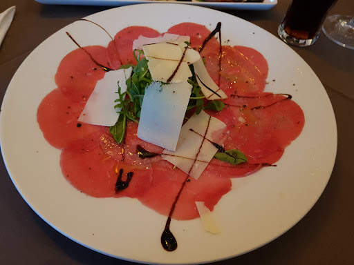 Wir hatten als Vorspeise eine Saisonempfehlung: Ein Trio aus Vitello Tonato (butterzart, würzig gebeizt, sanfte Thunfischsauce, knackig erfrischende Kapern), diversen Gemüse Antipasti und zwei Piccata Mellanzane (Auberginenschnitzelchen, mit Parmesan überbacken, mit einer dicken Scheibe Büffelmozzarella gefüllt). Dazu das Carpaccio vom Rind - einmalig auch die Parmesanhobel und schöner, frischer Rucola. Und die Hausspeise, Bruschetta - ein zeitloser Klassiker, hier im Hause perfekt zubereitet, ein wenig Knoblauch, schöne nicht zu saure Tomaten, Basilikum, Olivenöl - prima. Das verwendete Brot war knusprig geröstet, aber nicht zu splitterig-hart zu beissen - auch hier wurde mit demselben tollen Rucola gearbeitet. Alles in allem waren die Vorspeisen mit einer feinen Crema di Balsamico verziert und benetzt.