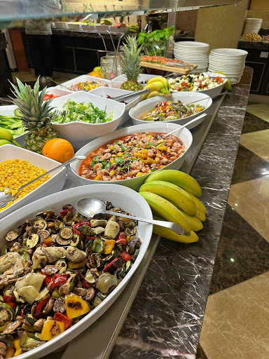 The buffet has a large selection of delicious, fresh foods. There's a teppanyaki/hibachi station in the back for meat and fish lovers. After you've satisfied your appetite with all you can eat, you can have your choice from a big selection of dessert as well. All dishes are labeled in Deutsch.