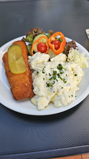 Der Junge Mann vom Service hat sich wirklich mühe gegeben und anfänglich auf die wünsche des Gastes einzugehen. Ich habe ein Bier und den Backfisch mit Kartoffelsalat bestellt. Keine für 5 Minuten später kam das Bier. Ein Fettvermierties Glas mit Fettgingerabdrücken bis hoch zum Rand, keine Blume und Schlieren innen am Oberen Rand.... Sorry leute das geht nicht. Das ganze Reklamiert und auch einen Austausch bekommen. Ich möchte behaupten es war das gleiche Glas nur das die Fettschlieren versucht wurden abzuwischen... Leider kam da schon mein Essen... und habe somit verpasst zu gehen. Das Essen war ganz okay muss ich sagen. Der salat hätte etwas besser gewaschen sein, er knierschte noch zwischen den Zähnen.
