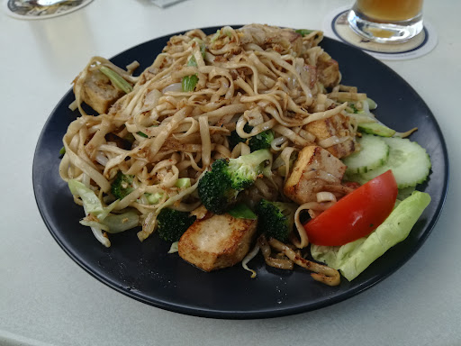 Meistens geht es ja schief, wenn ein Restaurant deutsche und asiatische Küche verbindet. Hier leider auch. Salat war schwer zu essen, weil der Teller total überladen war und die Hälfte rausgefallen ist. Das Joghurtdressing hat eher nach Wasser geschmeckt und einige Salatblätter hatten braune Stellen. Als Vegetarier hat man leider kaum Auswahl, daher habe ich einmal Tofu mit Gemüse bestellt. Dieses wurde in einer Bratensoße serviert, was ich schon mal ziemlich komisch fand, denn diese ist weder vegetarisch noch typisch thailändisch. Gemüse war ganz lecker, der Tofu hatte leider eine gummiartige Konsistenz und schmeckte auch so. Die gebratenen Nudeln, von denen ich einmal probiert hatte, schmeckten gut, aber da kann man auch nicht viel falsch machen. Der Blick auf den Main ist super und die Bedienung war okay, aber dennoch werde ich nicht noch...