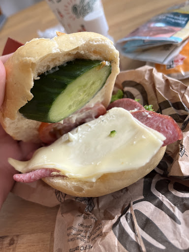 Eigentlich eine sehr gute Bäckerei, aber habe heute 2 Milchkaffee & ein Käsebrötchen ohne Butter und mit Remoulade bestellt. Nach langer Diskussion, dass ich 2 laktosefreie Kaffee wollte, habe ich 2 entkoffeinierte schwarze bekommen, was mir und meiner Freundin erst später aufgefallen ist. Außerdem fragte der Mitarbeiter mich, ob ich auch Salami auf das Brötchen haben möchte, was ich mehrmals verneinte. Als ich gerade dieses Brötchen essen wollte, sah ich 2 Scheiben Salami, eine Scheibe Käse, und eine mit Butter beschmierte Brötchenhälfte, aber keine Remoulade:) Nicht zu vergessen die Gurkenscheibe. die größer ist als meine Zukunftsaussichten 🥲 (Wie auf den Bildern zu sehen). Sprachbarrieren sind überhaupt kein Problem für mich, Unhöflichkeit bei Unverständnis seinerseits aber schon. Ich dachte es wäre klar was ich möchte, nachdem ich es dreimal erklärt habe. Wie gesagt, das erklären ist echt kein Ding, aber würde mir dann schon das richtige Ergebnis für das Geld wünschen:) Dies bezieht sich allerdings nur auf den einen...