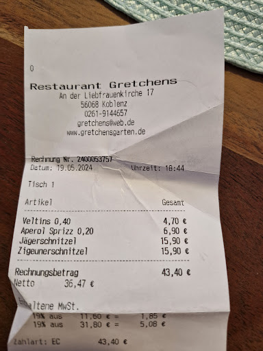 Read morePuh...ich weiß gar nicht, wo ich anfangen soll. Hab vor einigen Wochen einen Tisch reserviert, da wir über Pfingsten in Koblenz einen Städtetrip gemacht haben. Durch googeln bei Restaurants sind wir auf das Gretchens gekommen. Speisekarte las sich ansprechend. Dort angekommen..eine laminierte kleine Speisekarte mit ein paar Salaten, Schnitzeln usw. Diese entsprach überhaupt nicht der von der Website. Nachgefragt...es gäbe nur diese und der Chef hat den Laden erst übernommen und wäre noch nicht dazu gekommen diese zu ändern. Auf Nachfrage bei der Bedienung am Tisch, seit wann denn der Betreiber gewechselt hat, sagte man uns seit 2018.. Alles klar..😂 Nun zum Essen.. Haben uns für Schnitzel entschieden..die Schnitzel kamen innerhalb weniger Minuten.. aus der Friteuse mit Champignonsoße aus der Packung oder irgend sowas. Einfach mindere Qualität..eher schlechtes Imbissessen. So schlecht haben wir noch nie, wirklich niemals gegessen. Wir wollten das mit dem "Chef " klären. Ein hektischer Kellner erklärte uns der Chef sei nicht da. Daraufhin eine Bedienung gefragt wer denn der Chef sei..sie sagte ,der Herr in der kurzen Hose. Genau das war der hektische ' Mitarbeiter ' . Unglaublich sowas. Er wurde sehr frech, als wir ihn auf das schlechte Imbissessen ansprachen. Absolut 'kritikresistent' der Herr. Selbst das eine Schnitzel war aussen sehr dunkel und innen komplett roh.. Leider habe ich kein Foto gemacht bei dem ganzen Stress. Selbst am Nachbartisch meinte jemand das liest sich wie eine Imbisskarte. Ein anderer Tisch mit großer Gruppe hat dort nichts mehr zum Essen bestellt nachdem sie unser Essen gesehen haben und auch mitbekommen haben, wie der"Chef" sein Personal 'zusammengefaltet' hat, weil sie wahrscheinlich die Wahrheit gesagt haben und nicht für ihn 'gelogen' haben. Fazit...jeder muss seine eigenen Erfahrungen machen..nur wir werden niemals wieder diesen...