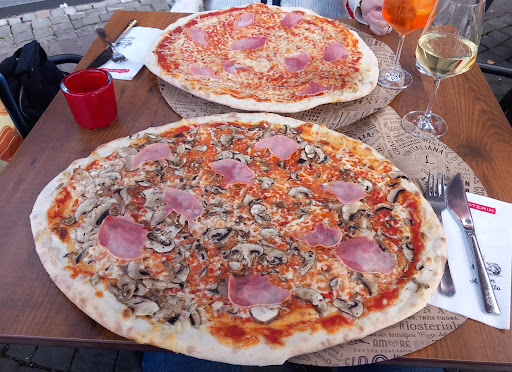 Trotz einer vorgenommen Online-Tischreservierung mussten wir bei unserer Ankunft zunĂ€chst noch warten und wurden vom Service-Personal "in Warteposition" an die Bar verwiesen. Dass es nicht immer möglich ist, das Zeitfenster der Reservierung unmittelbar einzuhalten, liegt aber auf der Hand und stellte grundsĂ€tzlich auch fĂŒr uns kein groĂes Problem dar...An der Bar wartend, wurden wir jedoch auch vom Bar-Personal ignoriert und man hat es seitens der L'Osteria leider versĂ€umt, zusĂ€tzlichen Umsatz zu generieren. Wir hĂ€tten uns die Wartezeit auf unseren Tisch gerne mit einem Aperitif verkĂŒrzt, jedoch hielt es das Bar-Personal wohl nicht fĂŒr nötig, uns nach unseren WĂŒnschen diesbezĂŒglich abzuholen... Nach einer circa 10-MinĂŒtigen Wartezeit und entsprechend lĂ€nger Ignoranz des Bar-Personals kam der Service-Mitarbeiter, um uns einen Tisch im Innenraum zuzuweisen. Auch hierbei fĂŒhlten wir uns insofern nicht 'abgeholt', da wir gar nicht gefragt wurden, ob wir nicht lieber auf einen Tisch im AuĂenbereich warten wollten. Unser Tisch lag unmittelbar neben dem Zugang zur SpĂŒlkuche. Durch das unangenehm lautstarke Ambiente und die lokale NĂ€he zur SpĂŒlkuche verstĂ€rkte sich die von uns empfundene AtmosphĂ€re eines "Bahnhof-Wartesaals" nochmals. Kein Vergleich zu den oben erwĂ€hnten, viel positiveren Erfahrungen in den drei anderen "Filialen", die wir bislang gemacht hatten. Unsere Tisch-Bedienung lieĂ dann zunĂ€chst erfreulicherweise nicht lange auf sich warten und versorgte uns mit den ĂŒblichen Speisekarten-Untersetzern und nahm auch die GetrĂ€nke-Bestellung umgehend auf. Auch die Zeitspanne zwischen GetrĂ€nke-Bestellung und Bestellaufnahme fĂŒr's Essen ging durchaus in Ordnung und bei dieser Gelegenheit brachte man uns auch Besteck sowie Essig und Ăl sowie Salz und Pfeffer an den Tisch. Bis dann jedoch die als Vorspeise bestellte Bruschetta serviert wurde, verging gefĂŒhlt eine halbe Ewigkeit (20 Minuten) und im Anschluss dauerte es noch einmal so lange, ehe die Vorspeisen-Teller wieder abgerĂ€umt wurden. Die servierten Brotscheiben waren ungleichmĂ€Ăig gebacken / gebrĂ€unt und an einigen Stellen quasi ungetoastet, wĂ€hrend andere schon verkohlt serviert wurden. Zudem war unsere Tisch-Bedienung aber noch nicht sehr routiniert und scheinbar auch hoffnungslos ĂŒberfordert (statt abgerĂ€umtes Geschirr z.B. gleich in die unmittelbar neben unserem Tisch befindliche SpĂŒlkĂŒche zu bringen - wie es die ĂŒbrigen Kolleginnen taten - tĂŒrmte unsere Bedienung das abgerĂ€umte Geschirr lieber erstmal auf AblageflĂ€chen neben der SpĂŒlkĂŒche gegenĂŒber unseres Tisches auf, was dem Thema der 'AtmosphĂ€re' nochmals einen Abzug beschert). Und so verging nach dem AbrĂ€umen der Vorspeisen-Dishes nochmals eine knappe halbe Stunde, bevor wir dann eine nicht durchgebackene und lieblos zusammen-geschusterte Pizza serviert bekamen. Der Rand und Boden der Pizza waren noch blass und wiesen nichts von dem sonst fĂŒr die L'Osteria typischen 'Crunch' auf und die Pizza lieĂ neben Knusprigkeit auch eine ausgewogene und einigermaĂen gleichmĂ€Ăige 'Belegung' komplett vermissen. Einige Bereiche des Bodens hatten zudem gar keine Tomatensauce abbekommen und 2 Parma-Schinkenscheiben wurden 'am StĂŒck' und unmittelbar nebeneinander auf die Pizza 'gelegt'. Ohne eigenstĂ€ndig vorgenommene 'Umverteilung' der Zutaten wĂ€re die Verteilung der fĂŒr 2 Personen bestellten Pizza völlig unausgewogen gewesen. Ein GetrĂ€nk, welches beim Servieren der Hauptspeise bestellt wurde, bekamen wir erst serviert, als der Hauptgang bereits vollstĂ€ndig...