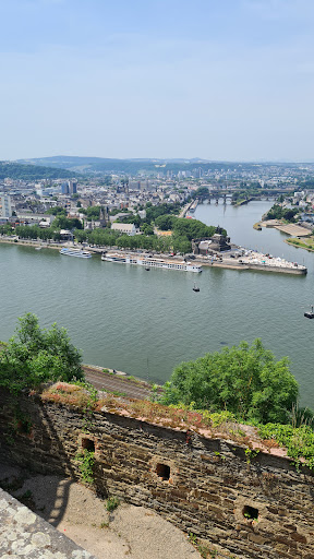 Read moreWir hatten das Glück unser Essen bei herrlichem Wetter auf der Terrasse unter den Sonnenschirmen zu genießen. Die Aussicht ist phänomenal. Trotz der angespannten Personallage in der Gastronomie waren wir sehr zufrieden mit unserer Bedienung. Es bemühten sich mehrere junge Leute um uns, die sicherlich noch etwas Erfahrung benötigen aber dennoch ausgesprochen freundlich und zuvorkommend waren. Das Restaurant war trotz des guten Wetters und Sonntags nicht allzu gut besucht, es waren vielleicht 10 Tische besetzt, über die Innenräume kann ich nichts sagen. Wir waren zu fünft unterwegs und hatten reserviert, dies wäre jedoch nicht erforderlich gewesen. Die Getränke kamen bis auf die hervorragende . wohl selbst angemischte, Johannisbeerschorle und das Bier in Flaschen. Die Speisekarte war übersichtlich , klein aber die Auswahl sollte für jeden etwas bereit stellen können. Zwei von uns entschieden sich für den klassischen Elsaß-Flammkuchen, einer für die Veggieversion. Der Preis , die optische Gestaltung als auch der Geschmack wurden für angemessen und gut befunden. Meine Frau nahm das Rumpsteak, auch hier schien der Preis angemessen, aber sie war mit der Konsistenz und dem Geschmack des Fleisches nicht zufrieden. das Grillgemüse war tatsächlich etwas übergrillt. Das gibt die Farbe auf dem Foto wohl auch so her. Die Pommes waren nicht schlecht, wir haben aber auch schon knusprigere gegessen. Ich selbst entschied mich als Vorspeise für den Büffelmozzarella und als Hauptgang für das echte Wiener Schnitzel mit Kalb, bestellte das auch statt des Kartoffelsalats mit Pommes, dies ist jedoch wohl bei der Servicekraft nicht angekommen, und so erhielt ich doch den Kartoffelsalat. Der Salat hat mir sehr sehr gut geschmeckt. Er bestand aus aromatischen Kirschtomaten und Rucola mit einem angenehmen Dressing. Nachwürzen war nicht erforderlich, mir wurden jedoch Olivenöl und Balsamessig sowie Salz und Pfeffer ohne Nachfrage bereit gestellt. Letztendlich war ich wohl der Einzige der richtig Pech hatte, denn von meinem Schnitzel bin ich mega enttäuscht. Das war des Kalbfleisches , sofern es denn welches war, nicht würdig. Bereits an der Wellung des Fleisches konnte man erkennen, dass es viel zu schnell und viel zu heiß gegart wurde. Die Vermutung liegt nahe, dass es in die gleiche Fritteuse wie die Pommes geschmissen wurde. Es schmeckte tatsächlich nur nach verbranntem Öl und auch die Preiselbeeren änderten daran nichts. Den Kartoffelsalat habe ich probiert, aber das war leider auch nicht mein Geschmack. Zum Dessert nahmen wir einen Eiskaffee sowie ein gemischtes Eis aus Vanille und Schoko, andere Sorten gab es nicht. Es war ein gelungener Abschluss ohne ein besonderes Highlight zu sein. Die Preisgestaltung insgesamt ist in Anbetracht der elitären Lage und des Ambientes absolut in Ordnung. Ich hätte hier gerne insgesamt 3,5 Sterne gegeben, denn der Anspruch des Kochs könnte größer sein. Für das Essen geben wir drei Sterne, für die Atmophäre und die Bedienung gerne vier. Wir haben uns sehr wohl gefühlt und lange ausgehalten, das ist die Hauptsache !...