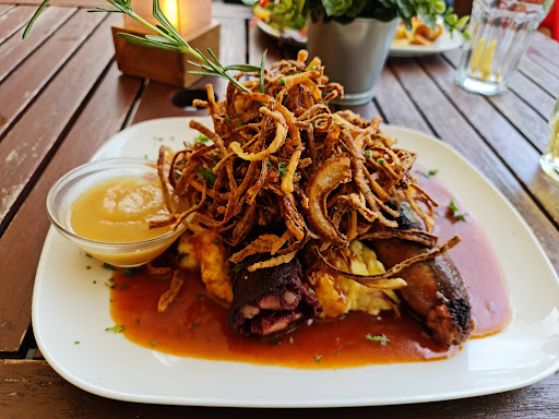 We had six different meals for the 6 of us, with multiple rounds or wine for a few ( the dark, wheat beer was a winner). The food was extremely delicious, well prepared, and in terms of spiciness, well defined. We had three desserts of which the Bailey's Vanilla Ice-cream was a clear epitome of elegance and rich. The location was beautiful, and the restaurant well maintained in terms of cleanliness and had a positive, vibrant environment. One of the highlights for visiting Koblenz. And...
