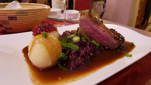 I had the duck, hubby had the venison, we shared a bottle of wine and a bottle of sparkling water. We also got a dessert each. Proteins were cooked and seasoned very well: The duck breast was nice and pink, the fat was nicely rendered, and the skin crispy. The venison was so tender you can cut it with a butter knife -- nicely browned on the outside but still pink, tender, and juicy on the inside. Knoedels were nice and suprisingly not too stodgy. The braised cabbage was tart and sweet and complemented the duck well. The wild mushrooms were earthy and worked so well with the venison. Desserts were also tasty -- not too sweet and a nice way to round off dinner. Wine that was recommended by the super nice and sweet server was also spot on.