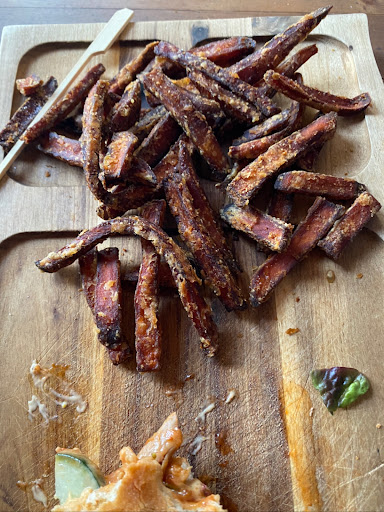 Das Essen war eher durchwachsen wir haben Käse Spätzle bestellt, die Portion hatte eher eine Vorspeisengröße. Wir haben ebenfalls den Pulled Pork Burger bestellt, dieser kommt gemäß Karte mit Süßkartoffel Pommes. Das Schweinefleisch war nicht gezupft (pulled) wie man es typischerweise kennt sondern hatte er die Größe von Döner Fleisch Stückchen. Die Süßkartoffel Pommes waren leider etwas lange in der Fritteuse beziehungsweise wurden in der Fritteuse wieder aufgewärmt. Dadurch gab es statt Pommes eigentlich nur leere dunkle Kruste.
