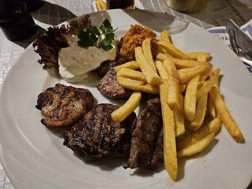 Das Essen war trotz viel Betrieb rasch am Tisch. Ca nach 5 Minuten kam schon der Salat. 10 Minuten darauf auch schon der Hauptgang. Bestellt hatten wir einen Gyrosteller und einen Grillteller. Fleisch war sehr gut gewürzt,kaum Fett beim Gyros sondern zartes Fleisch. Die Pommes die wir dazu geordert hatten waren knusprig und nicht übersalzen. Hier reicht man zum Gericht auch Tomatenreis. Absolut köstlich👌