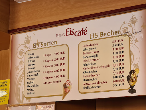 Petra's Eiscafe ist sehr populär in der Gegend und sorgt immer wieder für gute Stimmung. Im Eiscafe findet man 24 verschiedene Eissorten wie zum Beispiel Schwarze Johannisbeere, Himmelblau, Marshmallow und vieles mehr. Also zu besuchen lohnt es sich auf jeden Fall! Wenn man sein Becher selbst gestalten möchte, nur sagen und es wird nach Ihren Wünschen gemacht. Verschiedene Eisbecher gibt's auch wie: Eierlikörbecher, Schwarzwaldbecher usw.
