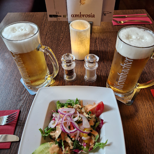 Wir waren am Sonntag, den 04.08.24, um ca. 18 Uhr im Ambrosian essen. Wir hatten vorher angerufen und einen Tisch reserviert. Wir wurden dann in den hinteren Teil rechts in eine Ecke gesetzt. An der Wand waren undefinierbare Flecken und der Boden voller Brotkrümel. Und dass, obwohl der Laden gerade erst geöffnet hatte. Die Speisekarte war recht klebrig und abgeranzt. Wir haben uns dann frittierte Sardellen und einen gebackenen Schafskäse als Vorspeise bestellt. Zu den tot frittierten Sardellen gab es dann drei Scheiben trockenes Baquette. Ich musste mir dann Zaziki kostenpflichtig dazu bestellen um die Sardellen runterzukriegen. Der gebackene Schäfskäse war dafür in der Mitte eiskalt. Er wurde angeschnitten einfach nochmal in die Friteuse geschmissen. Super Einstieg. Als Hauptspeise gab es dann einen Grillteller mit Schweinefilet und Giros mit Metaxasosse überbacken. Ich hatte darum gebeten, dass Fleisch bitte nicht durchzubraten. Dieser Wunsch ist wohl nicht in der Küche angekommen. Alles war absolut totgebraten und das angebliche Schweinefilet war keins. Und die Portion Zaziki war minimalistisch. Kenne ich sonst beim Griechen nicht so. Die Metaxasosse war eher eine Suppe und das alles dann mit einem Haufen billigsten Analogkäse überbacken. Nicht genießbar. Als ich dann die Mängel angesprochen habe wurde da gar nicht drauf eingegangen. Es kam nur ein patziges „Das war aber Schweinefilet“. Unmöglich! Eine Unverschämtheit! Der ganze Spaß hat dann, mit einer Flasche Wasser, stolze 65€ gekostet. Absolut nicht gerechtfertigt . Diesen Laden werden wir nicht mehr betreten. Da gibt es ja in einer griechischen Pommesbude...