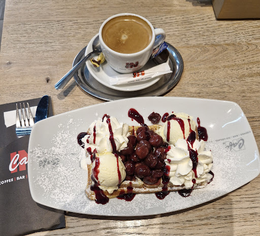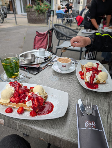 Read moreLeider hatte ich mein Handy im Auto vergessen :( Sonst hätte ich ein Foto vom Frühstück gemacht und mit hier rein gesetzt. Wir waren heute Morgen gegen 11 Uhr mal wieder da frühstücken, wie wir es öfter schon getan haben. Und es war sehr sehr voll. So voll dass wir uns rein setzen mussten weil trotz gefühlt 1000 Tischen draußen alles besetzt war( klar, jeder will bei dem schönen Wetter draußen sitzen). Aber dort war sowohl die Eingangstür offen als auch hinter meinem Sitzplatz die Scheiben offen, so dass man es trotzdem herrlich luftig hatte wie als wenn man draußen sitzen würde. Das war schon richtig klasse. Trotz dass es so mega voll war und sowohl der Inhaber als auch die Bedienungen massig zu tun hatten, war wie immer eine lockere, gut gelaunte und entspannte Atmosphäre die alle verbreitet haben und die Bedienungen wie immer superfreundlich. Und das Frühstück war wieder mächtig. Wir hatten beide je ein kleineres aber sind so satt geworden dass wir es jetzt noch sind. Das Salatblatt das ich auf dem Teller hatte war supergroß und sehr sehr lecker, ebenso wie die Tomatenscheibe und die echt große Gurkenscheibe. Dazu so viel Käse ( da ich Vegetarierin bin bitte ich immer die Wurst gegen Käse auszutauschen was auch immer problemlos gemacht wird). Die Brötchen sind immer total frisch, ebenso wie die Croissants. Auch auf meine Frage ob ich die Marmelade, die ich dazu bekommen hatte, gegen eine andere tauschen könnte wurde soo lieb reagiert und das auch direkt gemacht. Zuletzt noch der Eiskaffee und der Eisnusskaffe die wir dort immer trinken..GÖTTLICH! Wer gut und in schöner Atmosphäre frühstücken, Kaffee trinken, irgendetwas anderes trinken, Eis essen oder was auch immer will ist hier bestens aufgehoben. Für uns persönlich unser Lieblingscafe...